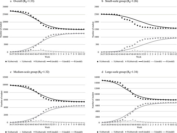 The initial values of each SIR model are shown in Table (1). Eighty-six students were infected before September 2009 (small-scale group: 3, medium-scale group: 28, large-scale group: 55); they were added to. The SIR model best fitted to the actual epidemic transition is shown in Fig. (2). The R0 values of the best-fitted model and difference between the cumulative infection rates of the absentee survey data were 1.33 and 0.4%, respectively, overall (model vs. absentee survey: 45.3% vs 44.9%); 1.26 and 0.3%, respectively, for the small-scale group (36.8% vs. 37.1%); 1.32 and 0.1%, respectively for the medium-scale group (44.3% vs. 44.4%); and 1.34 and 0.2%, respectively, for the large-scale group (46.4% vs. 46.6%). The larger schools had higher R0 values. There were no significant differences between the model and observation except in component I of the small-scale group: The p-values related to components S, I, and R were 0.78, 0.02, and 0.73, respectively. The predictive precision of the model for the small-scale group was not high compared with that of the other groups Fig. (2b). The estimated transition curve was more gradual than the observations, presenting a difference in trend from the 44th week of 2009.
