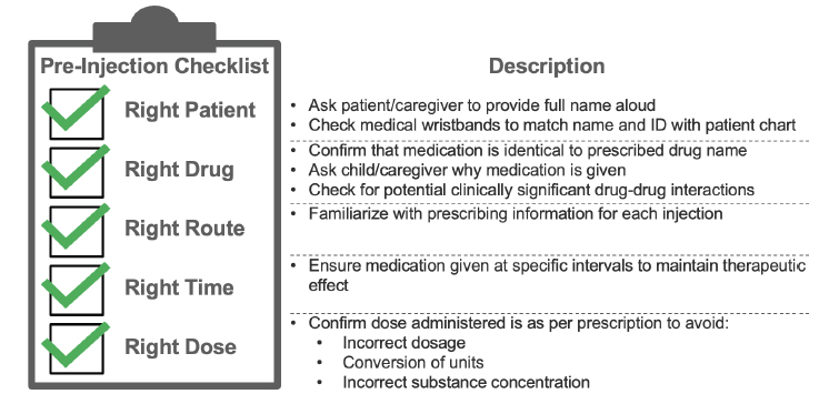 Nurses should confirm the “5 rights” of medication administration before each injection [59].