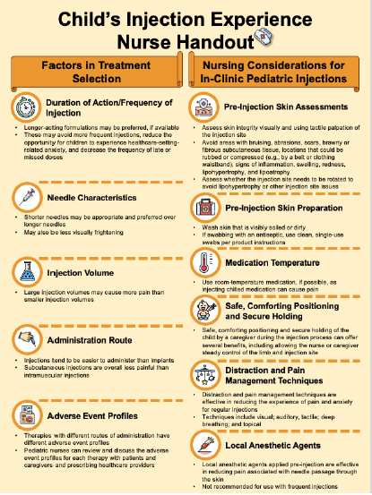 - Adverse event profiles: Pediatric nurses should be prepared to discuss adverse event profiles for different injection routes with patients, caregivers, and prescribing HCPs.