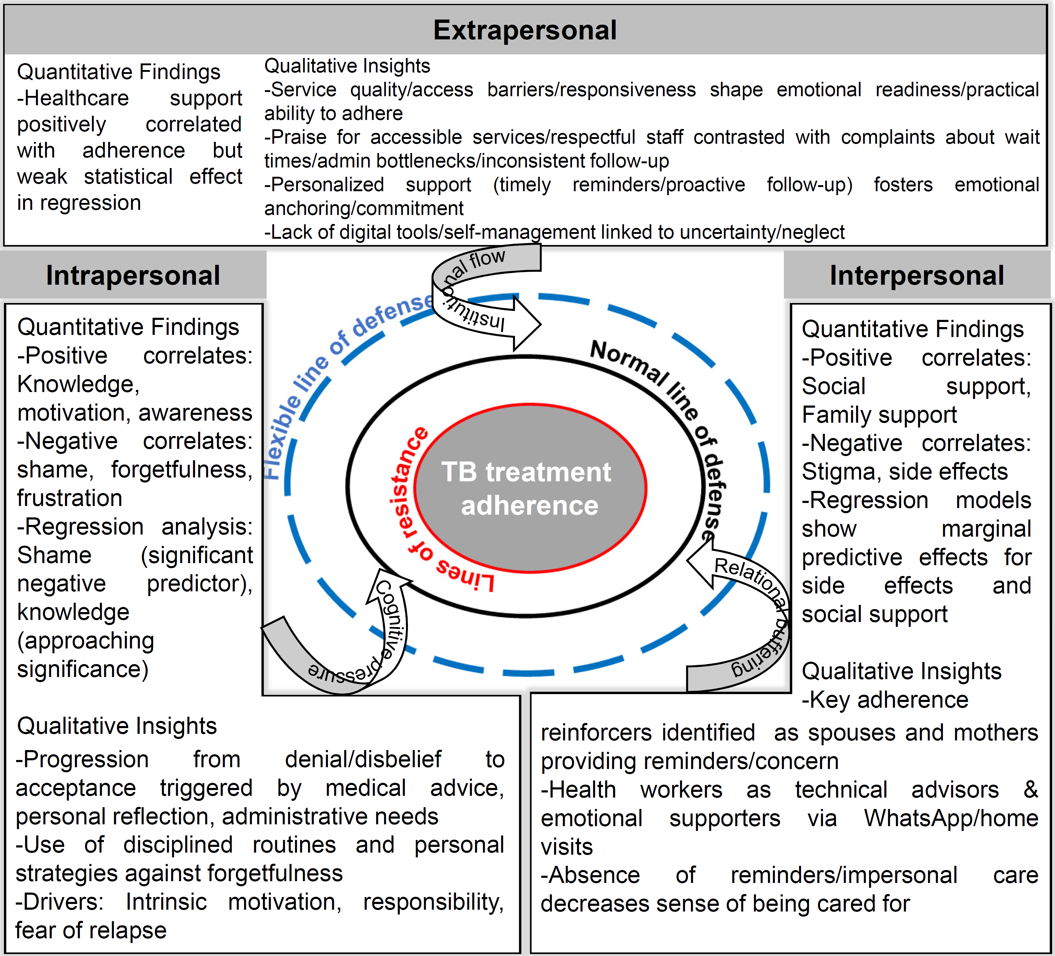 TB treatment adherence is shaped by cognitive and emotional processes at the intrapersonal level, reinforced by interpersonal support, and constrained by extrapersonal conditions. Integrating quantitative and qualitative evidence through Neuman's systems model clarifies how shame and forgetfulness undermine adherence, and how motivation and social support strengthen patients' adherence to treatment. Structural challenges are less evident in the statistical models but are articulated in patient narratives, highlighting the responsiveness of the system.